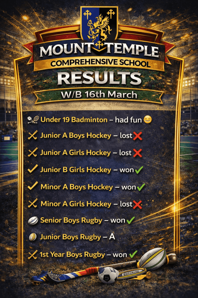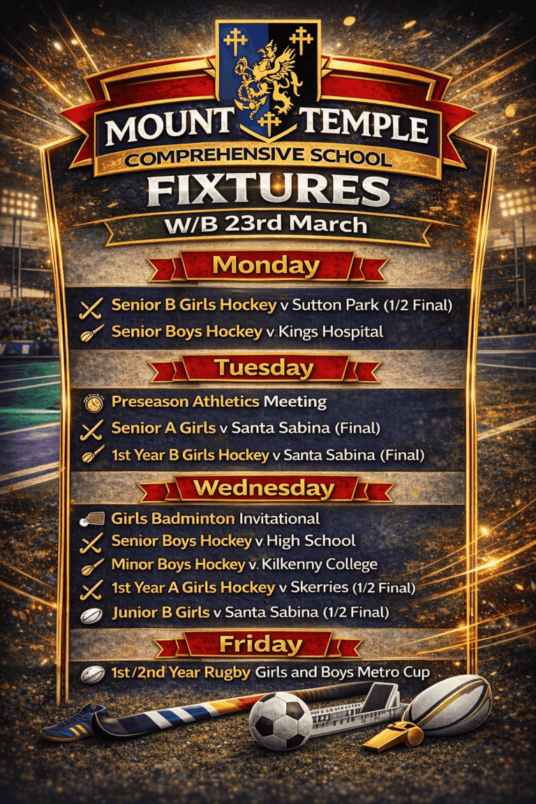 Mount Temple Comprehensive School strives for excellence in all aspects of culture, including sport, drama and music, wherein students are challenged and encouraged to realise their full potential.