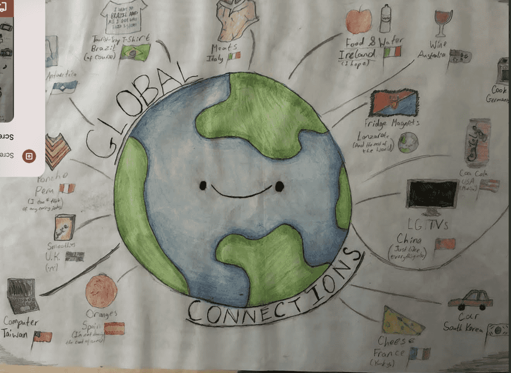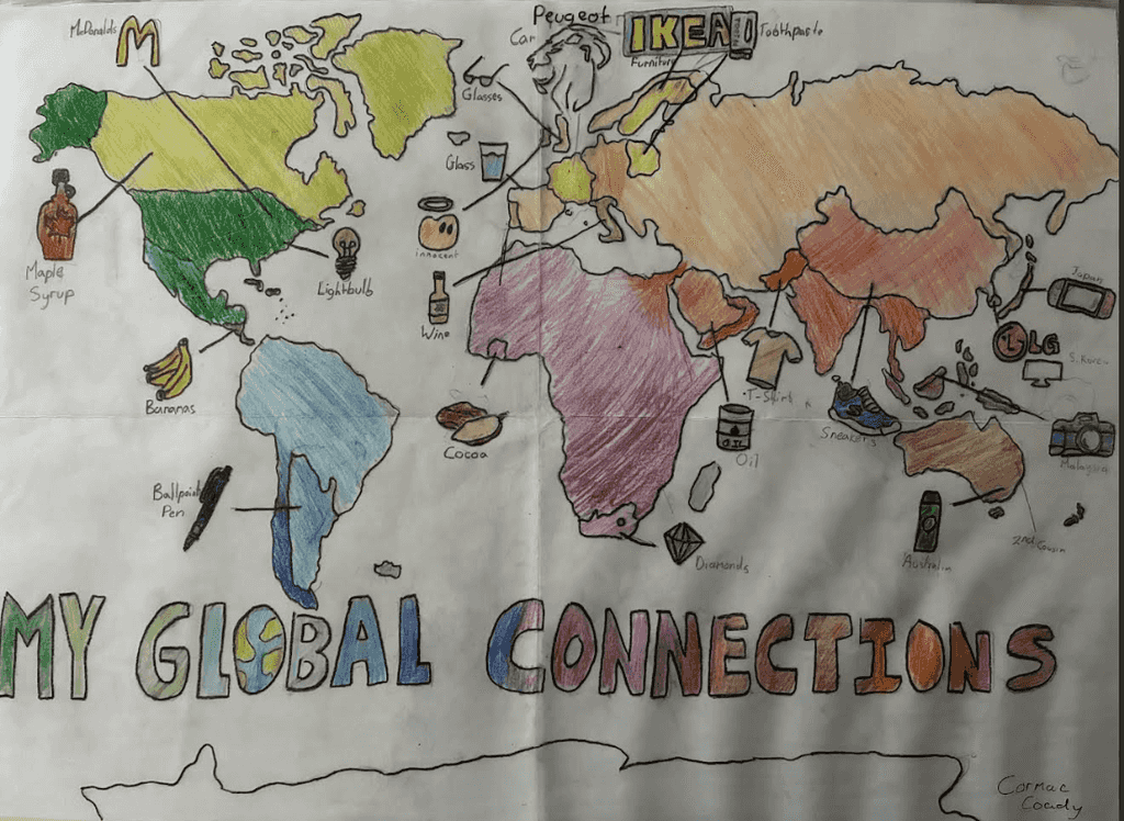In CSPE class the pupils of 2i had to create a poster showing how interconnected the world is today by showing how their lives are connected to other countries (e.g. clothes they wear, foods they eat, products they use etc..).