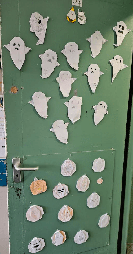 2nd year Japanese class made origami ghosts and pumpkins for Halloween.