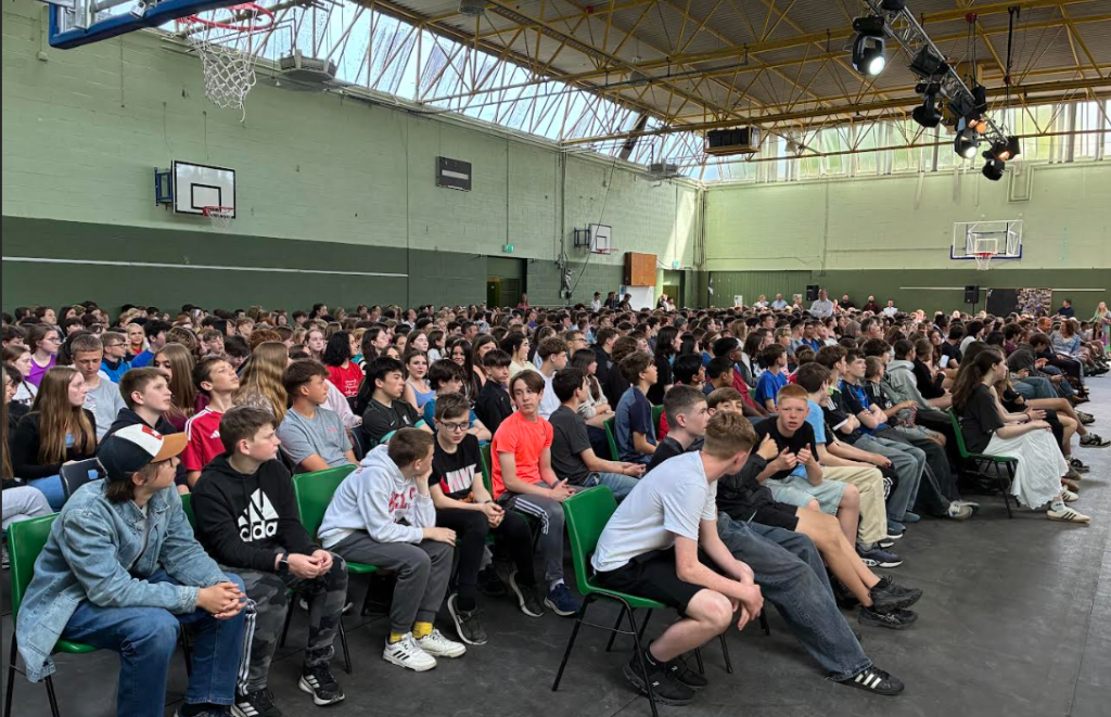 The entire school community (apart from TYs who are in the Gaeltacht or Work Experience) gathered in the gym yesterday for the annual Eye of the Clock Awards.
