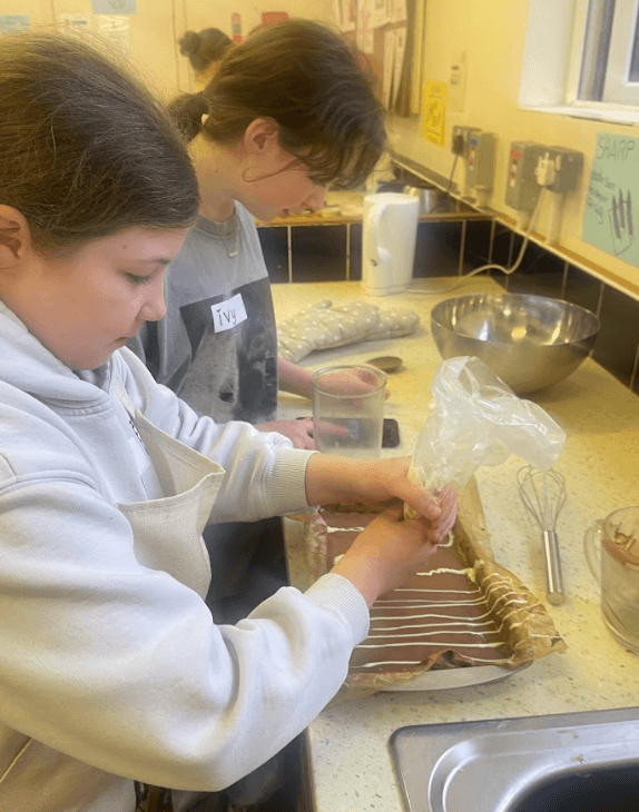 Students made the three layered dish from scratch with a melting method shortbread base, homemade caramel, and a simple ganache, and learned how to decorate by feathering the white chocolate to finish.