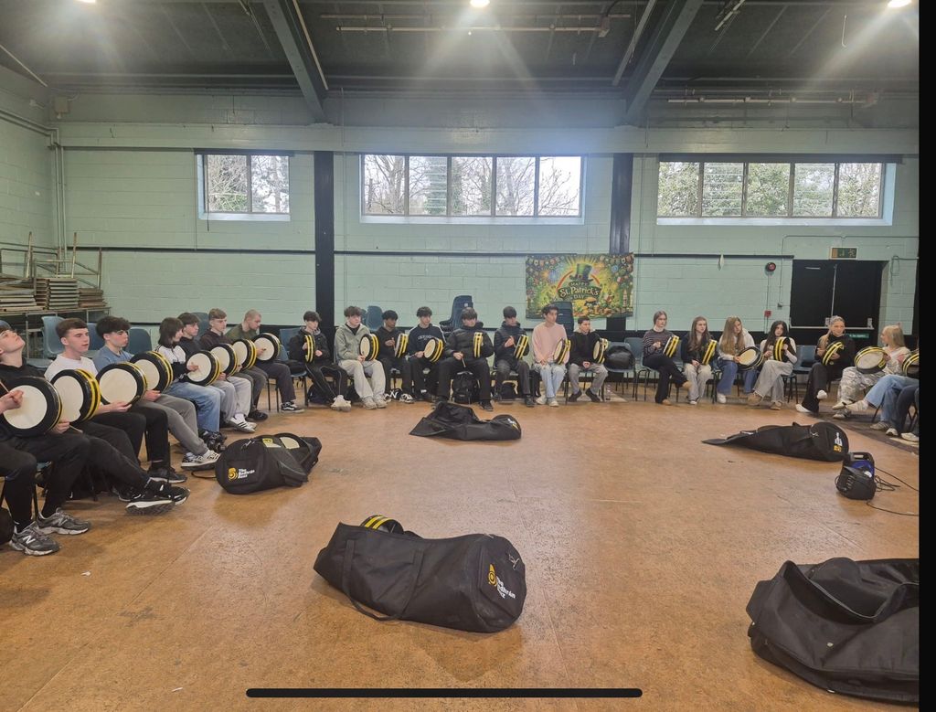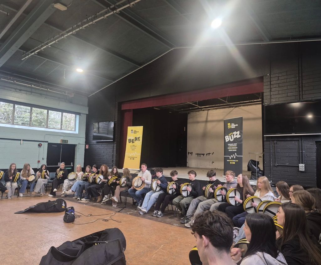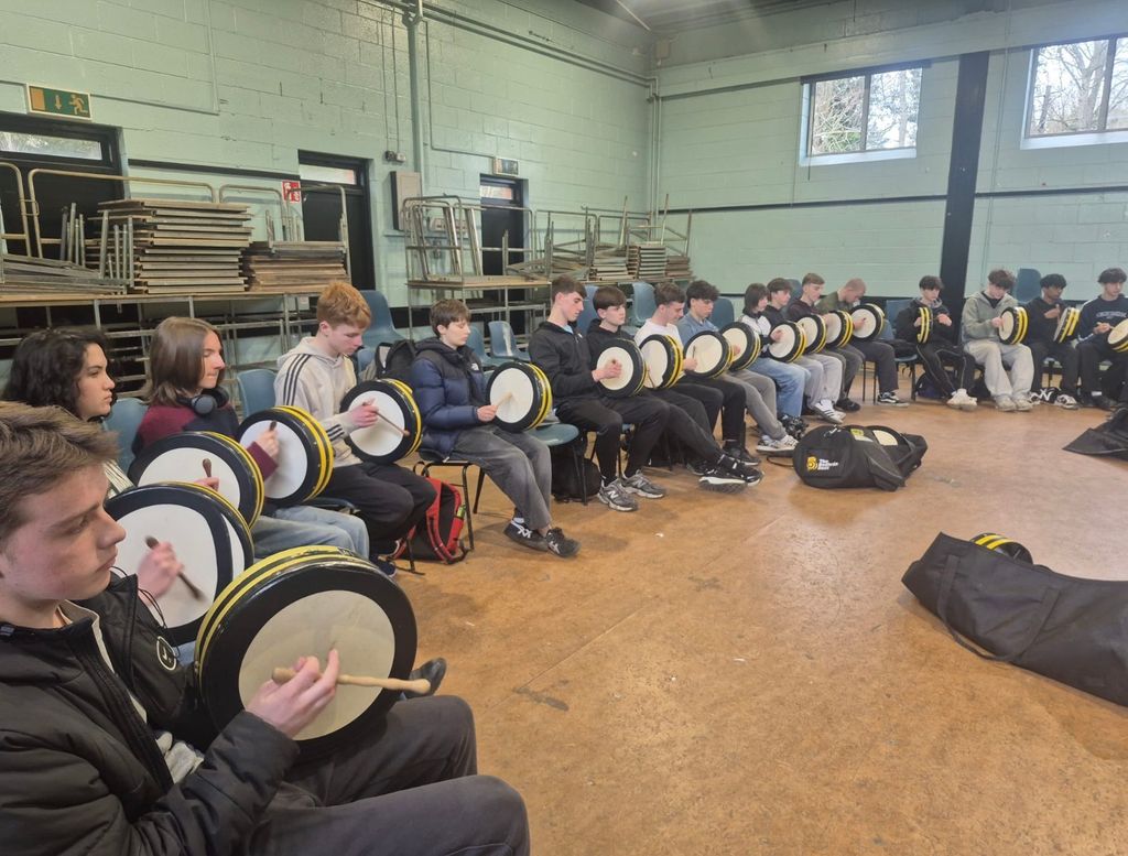 Ceardlann bodhráin faoi lán seoil sa scoil mar chuid de Sheachtain na Gaeilge.