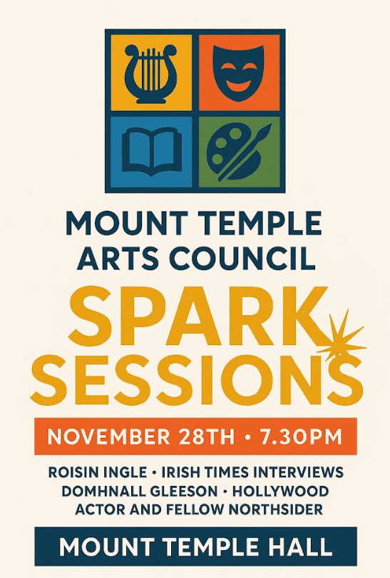 Our first Sparks session takes place this Friday evening, 28th November 2025, in Mount Temple Hall, when homegrown northside royalty, actor and screenwriter Domhnall Gleeson joins us in conversation with much-loved Dublin columnist, author and podcaster, Irish Times journalist Róisin Ingle. (Click here for tickets)